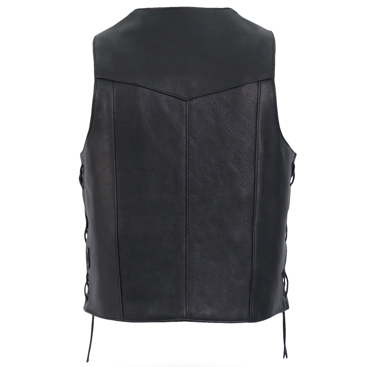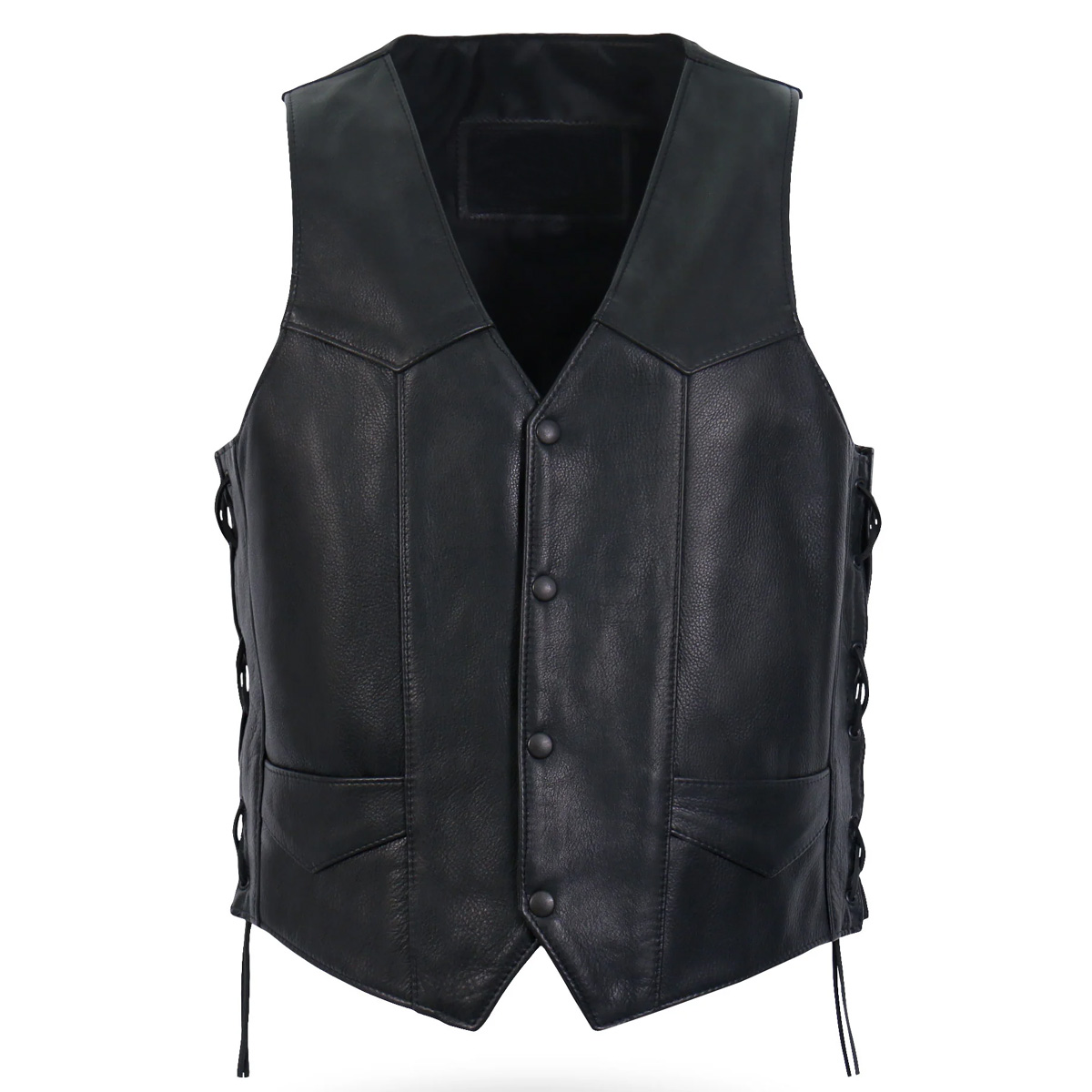 Full Grain Naked CowhideBlack Grommets and SnapsLace Up SidesTwo Front PocketsThree Inside PocketsSatin Lining