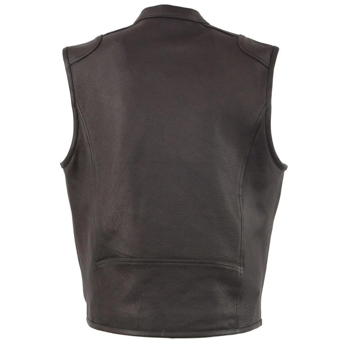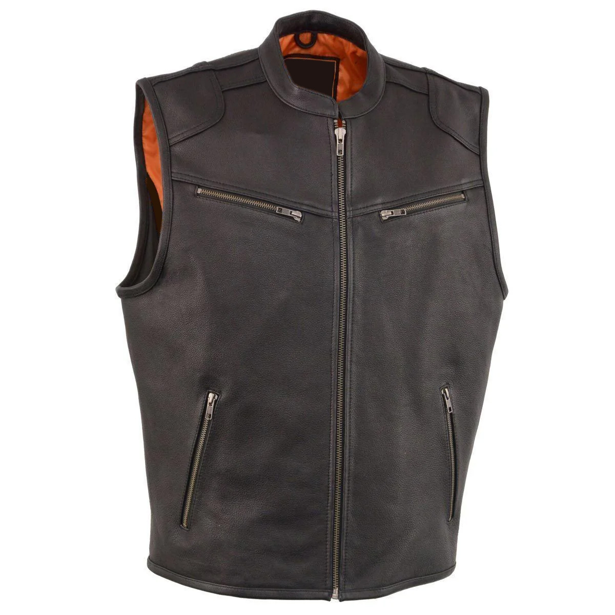 Made of Premium Cowhide Leather.Collarless Design.Front Zipper Closure.Extra Long Body Length.2 Lower Hand Pockets with Zipper Closure.2 Chest Pockets with Zipper Closure.