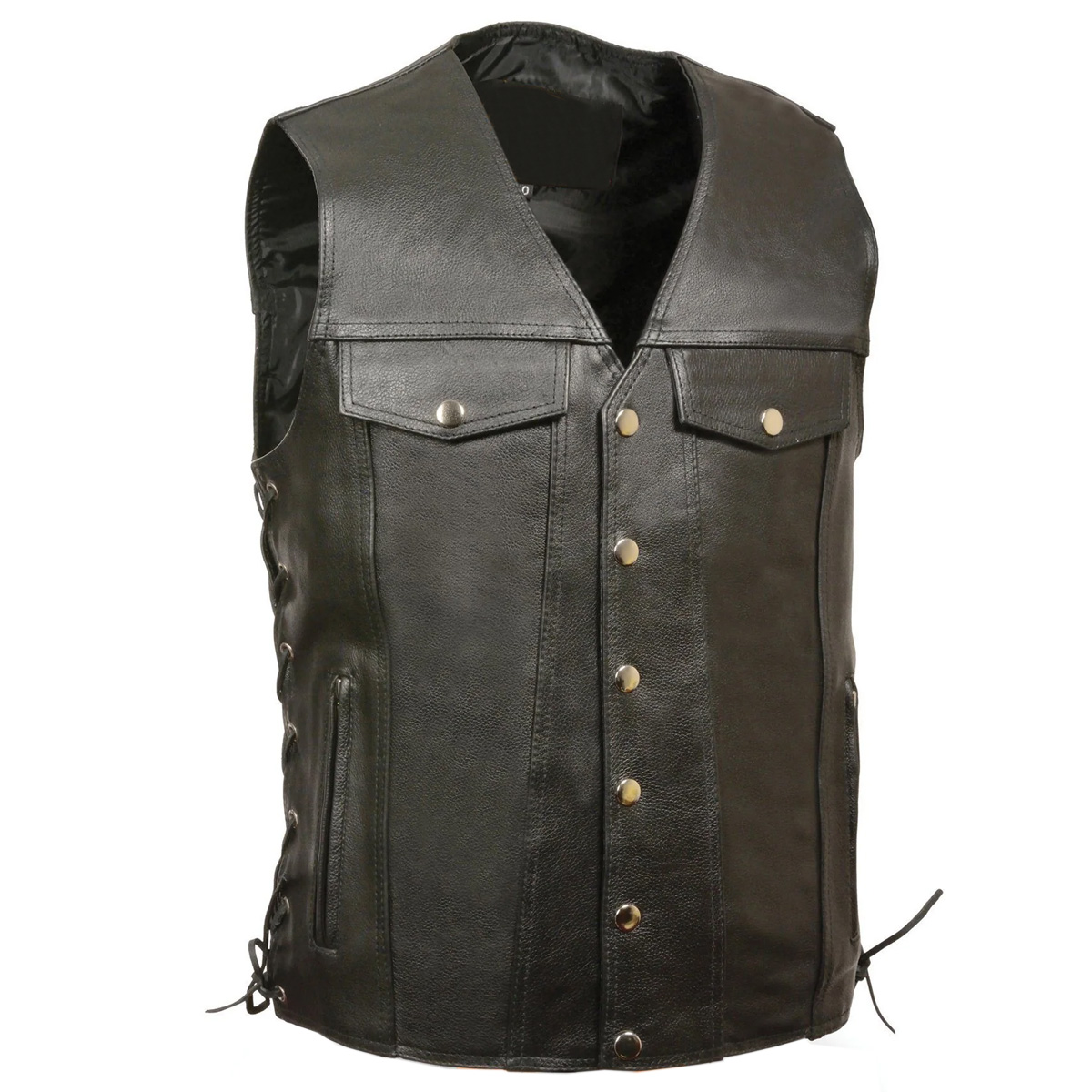 Made of Premium Milled Cowhide leatherClassic Snap Button Closure2 Lower Front Zippered Hand Warmer Pockets2 Denim Pocket Styles Chest PocketsAdjustable Side Laces for an Optimal FitInside Mesh Lining
