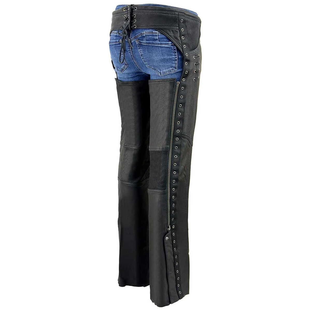 Made of Naked Goat Skin 1.1 - 1.2mm Thick Leather.2 outer lower thigh curve pockets with snap and zip closures.Elasticized inner thighs panel for an optimal snug fit.YKK Zippers.
